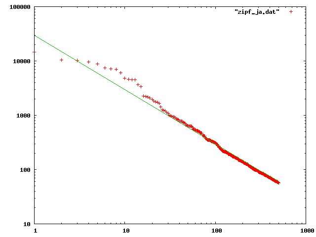>んでこの出力結果を gnuplot で、 set logscale xy してプロットしました。 > >追記: あんまり誰もツッコミを入れてくれない気がするので自分で書くけど、こういうのって mecab の採用しているアルゴリズムの影響も受けるよねぇ。上にもちょろっと書いたけど、ある文字列からどう単語を抽出するか、という背後には何らかのモデルがあるはずで、そのモデルの想定を測っているだけ、ということもあるだろうと。その辺どうなんですか、という気は、もちろんします。あんま詳しくないんでよくわからないんですが。 >