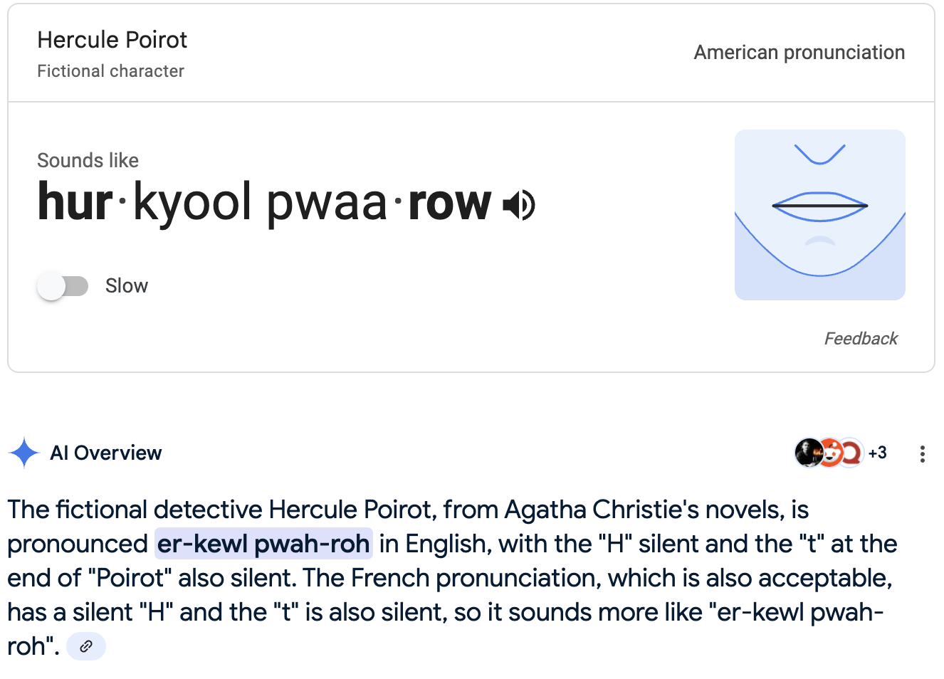 他の音声的情報源といえば、ドラマ版がありそうではある。デヴィッド・スーシェが演じてたアレ。私も子供の頃は大好きでよくみてました。もちろん自分が観てたのは熊倉一雄の吹き替え版だけども今の自分なら英語で観ればドラマ内の発音はわかるはずだ。もっともエピソードたくさんあるしそんなにHerculeの方は呼ばれていた気がしないが……とYoutubeで検索してみたところ、ありがたいことに「ポアロが自分の名前を呼んでるシーン集」という動画があった。自分ではやっぱりエルキュールと発音しているな。